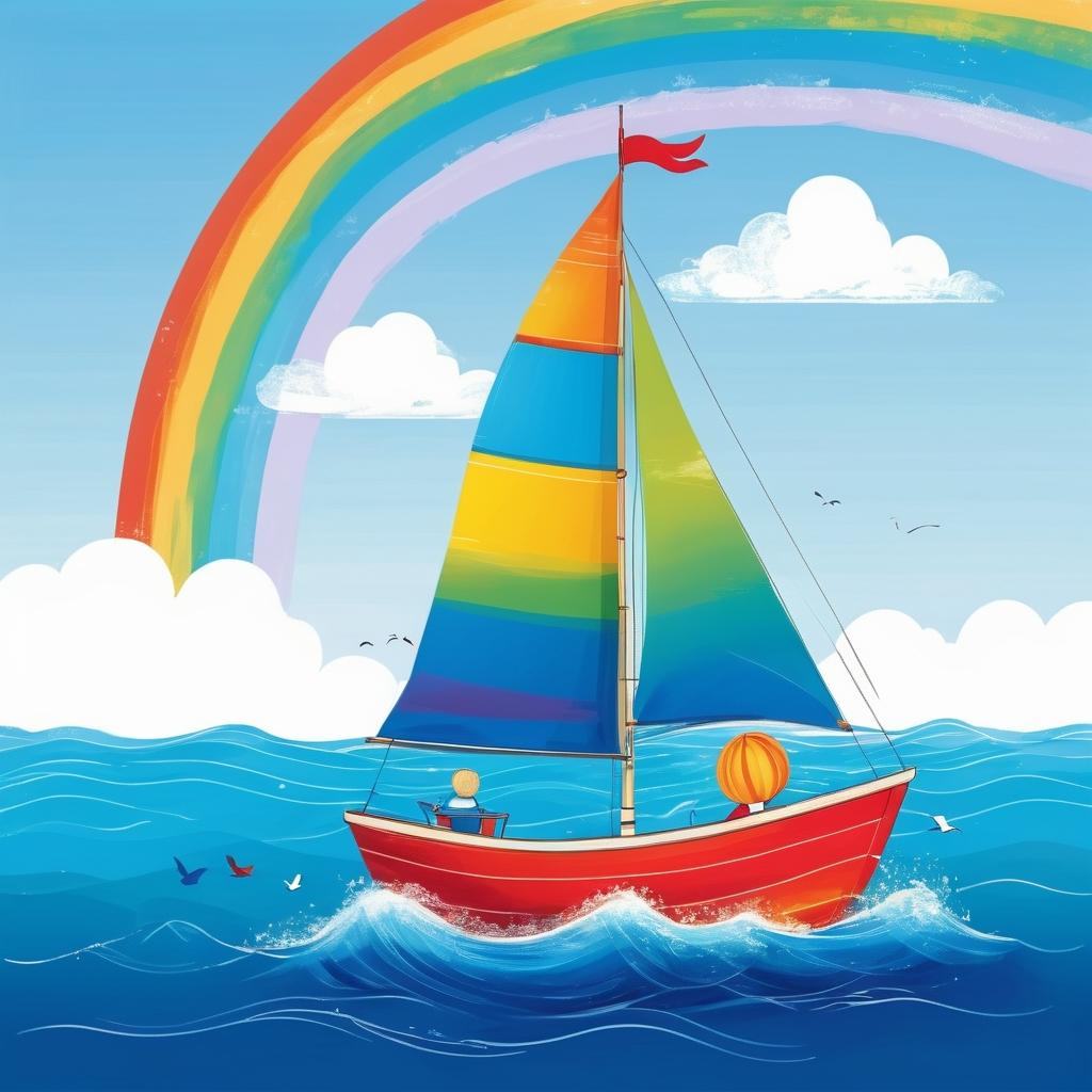 這幅作品以其簡單而富有童趣的表現形式而引人注目。彩虹色的運用讓畫面充滿了生機和活力,喚起了一種無憂無慮的童年回憶。為了讓作品更具深度,可以考慮增加背景元素,如波浪或天空,以強化帆船在水上航行的場景。此外,可以嘗試加入一些細節,比如船上的小旗子或海鳥,這將使畫面更豐富且富有故事性。這樣的提升會使作品更具藝術性和吸引力,尤其在兒童藝術教育中能激發更多的想像力。